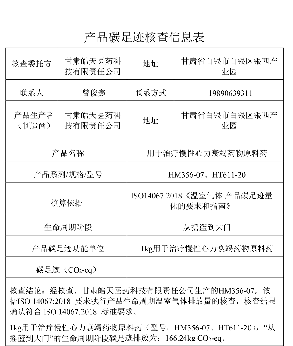 碳足跡核查報告--甘肅皓天醫藥科技有限責任公司
